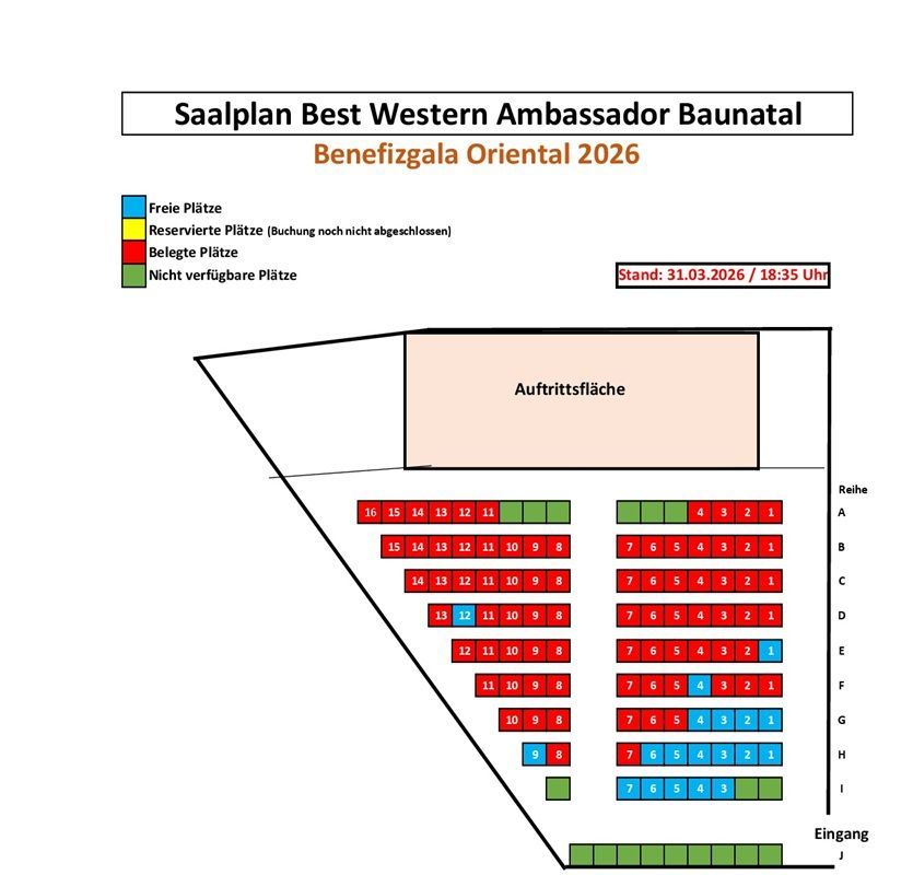 HINWEIS: Die Plätze werden in der Reihenfolge des Eingangs bearbeitet. Wenn Wunschplätze vergeben sind, werden alternative Plätze durch das Veranstaltungsmanagement vergeben. Der aktuelle Stand der Platzvergabe ist mit Datum auf dem Saalplan hinterlegt. Das bedeutet, wenn Buchungen nach diesem Datum abgesendet wurden, sind diese noch nicht bearbeitet worden. Bitte haben Sie noch etwas Geduld.